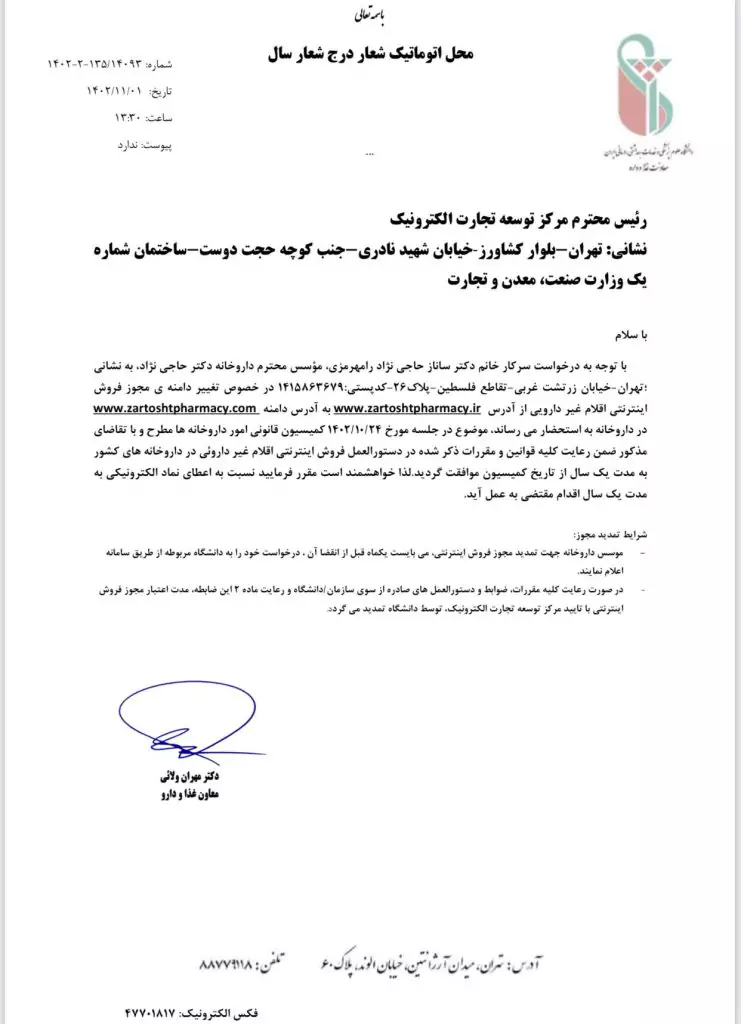 امکان خرید از داروخانه زرتشت، به صورت آنلاین، شبانه روزی و ۲۴ ساعته می باشد. داروخانه اینترنتی زرتشت (دکتر حاجی نژاد) دارای مجوز فروش آنلاین اقلام دارویی بدون نسخه، از وزارت بهداشت بوده و تحت نظارت مستقیم و مداوم دانشگاه علوم پزشکی ایران فعالیت خود را آغاز کرد. در سال ۱۴۰۰ به عنوان داروخانه های منتخب دارای مجوز سازمان غذا و دارو معرفی شد و در حال حاضر تحت نظارت دانشگاه علوم پزشکی شهید بهشتی می باشد.