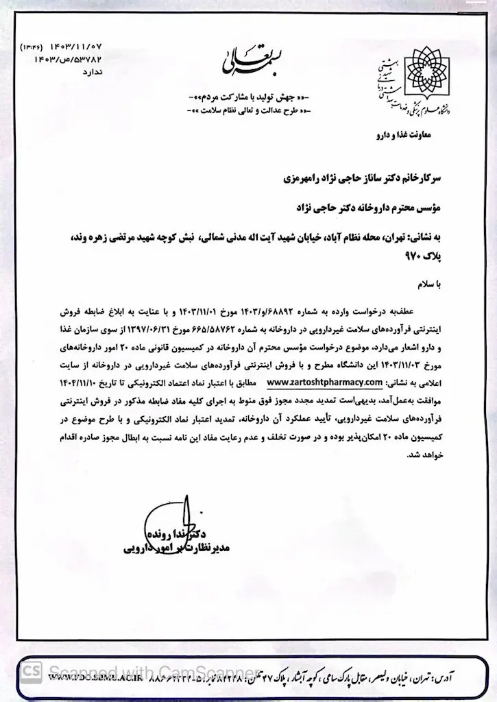 تمامی کالاها و خدمات داروخانه ۲۴ ساعته زرتشت، دارای مجوزهای لازم از مراجع مربوطه می باشند و فعالیتهای این سایت، تابع قوانین جمهوری اسلامی ایران و مقررات تولید و نشر محتوای آنلاین می باشد. رسالت داروخانه آنلاین زرتشت برای شما عزیزان، تجربه خرید آنلاین مثبت (ارسال آسان ) به همراه مشاوره تخصصی و رایگان توسط دکتر داروساز برای انتخاب محصول مناسبتر می باشد.